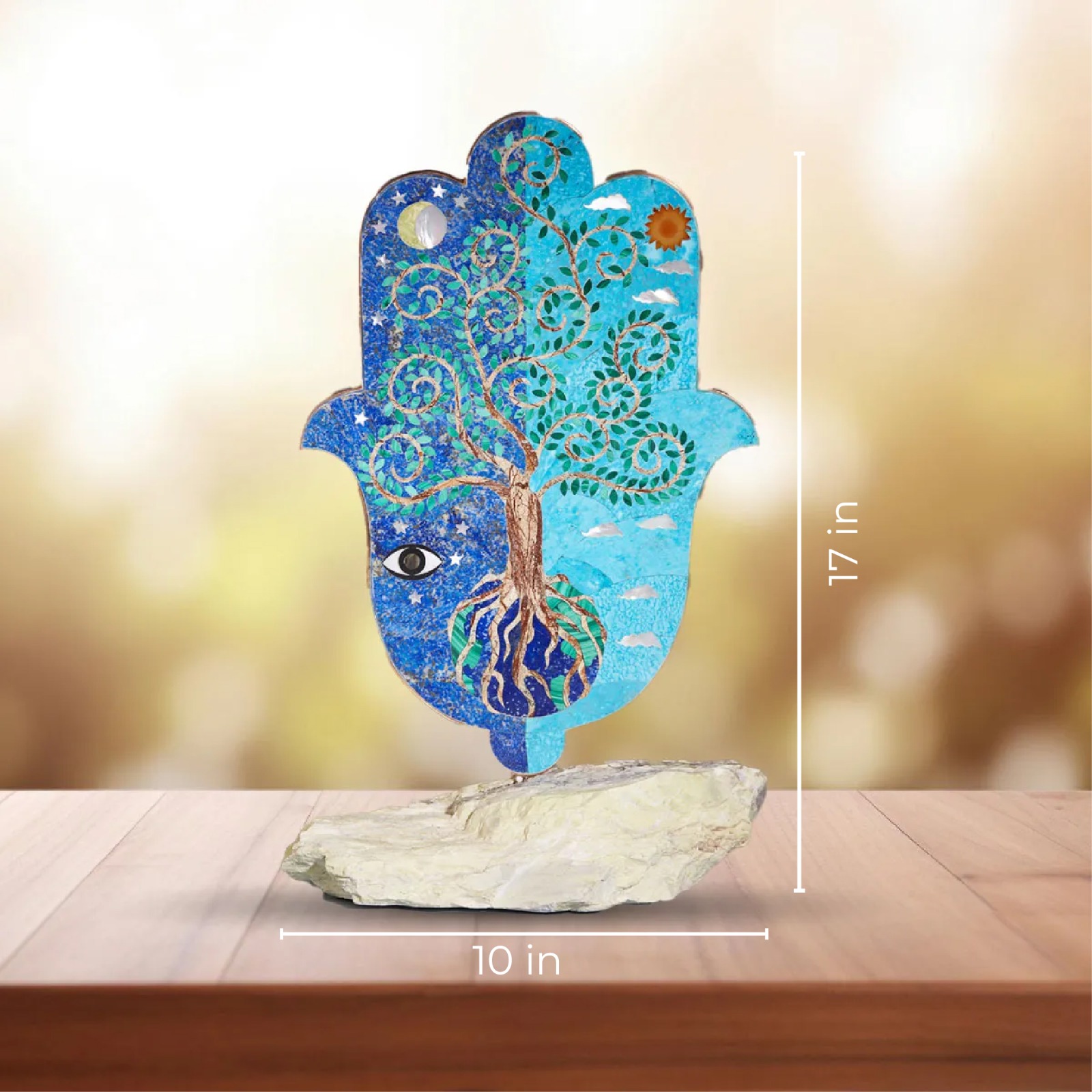 World Tree” by Varatan stands as an artistic marvel, merging natural stone into marble with intricate precision, all cradled in a copper plate. The stone base provides a sturdy foundation, subtly enhanced in color for a harmonious palette. The expansive canopy symbolizes day and night, bearing fruits of love, compassion, and peace. Each fruit embodies profound blessings, offering a journey from humble origins to Heavenly Bliss. Varatan’s craftsmanship transforms this piece into a unique exploration of self-discovery and fulfillment. “World Tree” emerges as a captivating testament to the fusion of art and nature, creating a distinctive presence in any collection.